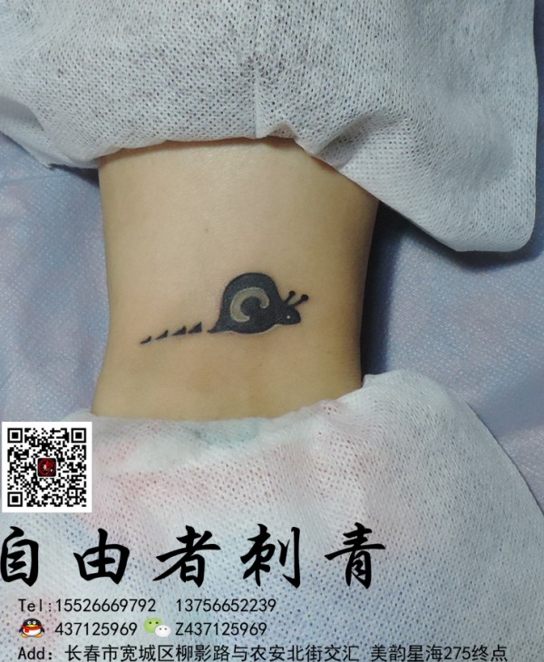 小腿部位上懒散的蜗牛纹身图案刚完成的蜗牛纹_腿部纹身图案大全_纹身图吧