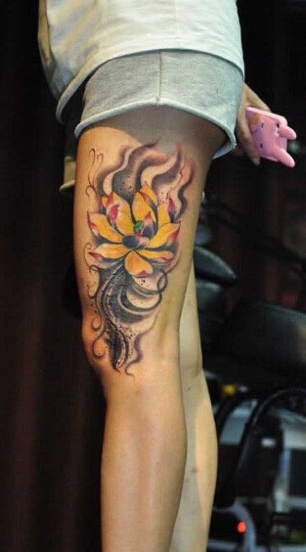 美女大腿上的流云风格荷花纹身图长腿漂亮,纹_腿部纹身图案大全_纹身图吧