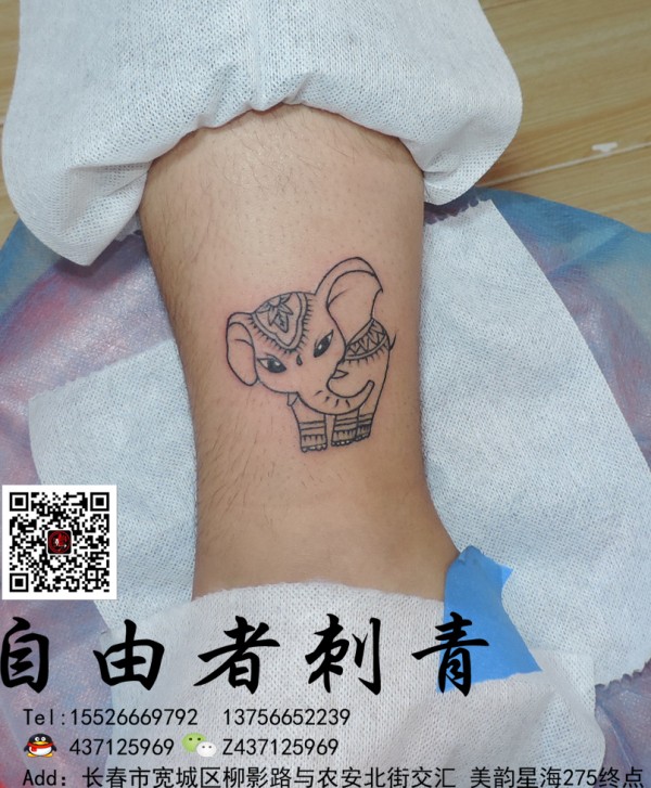 小腿上单线风格小象纹身刺青图_腿部纹身图案大全_纹身图吧