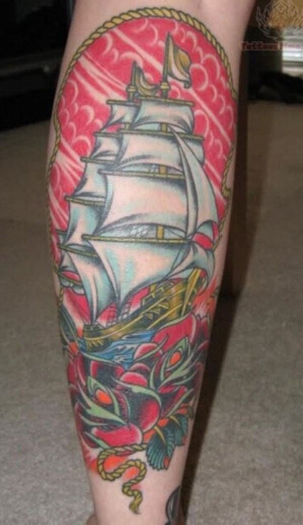 小腿上彩色与素色帆船纹身图案对比红色主题的_腿部纹身图案大全_纹身图吧