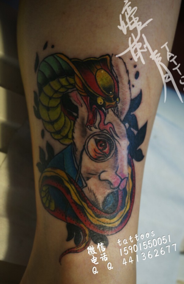 腿部蛇盘兔彩色纹身图案推荐纹身图案寓意蛇_腿部纹身图案大全_纹身图吧