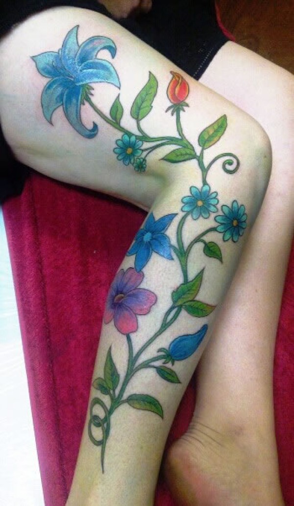 布满整条腿部的长型花藤纹身彩色花藤纹身_腿部纹身图案大全_纹身图吧