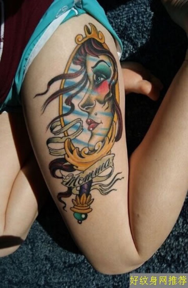 大腿上的镜子图案彩色纹身镜子中的美女图案彩_腿部纹身图案大全_纹身图吧
