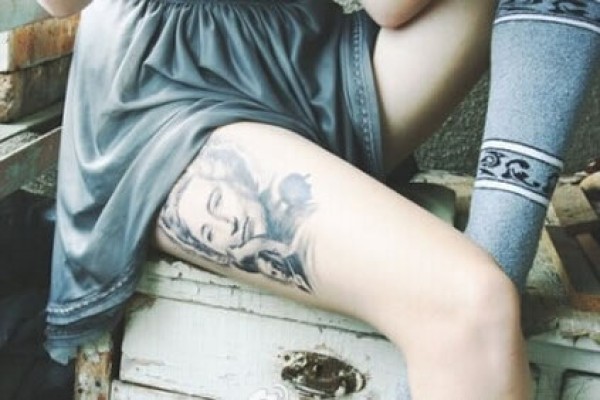女士大腿上灰色人物肖像纹身图看到这样的美腿_腿部纹身图案大全_纹身图吧