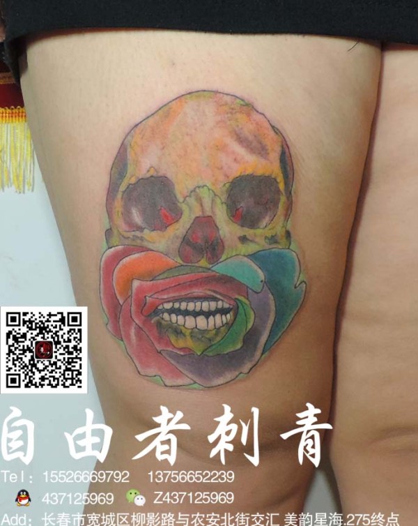 女士大腿上彩色的骷髅头图案纹身小丑装扮的彩_腿部纹身图案大全_纹身图吧