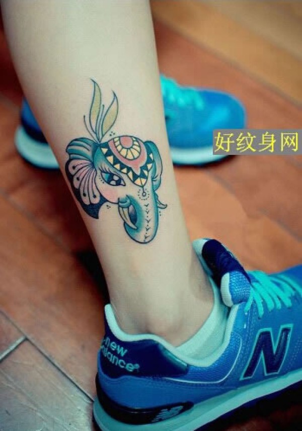 小腿部位的彩色象神纹身图案欣赏可爱风格的象_腿部纹身图案大全_纹身图吧