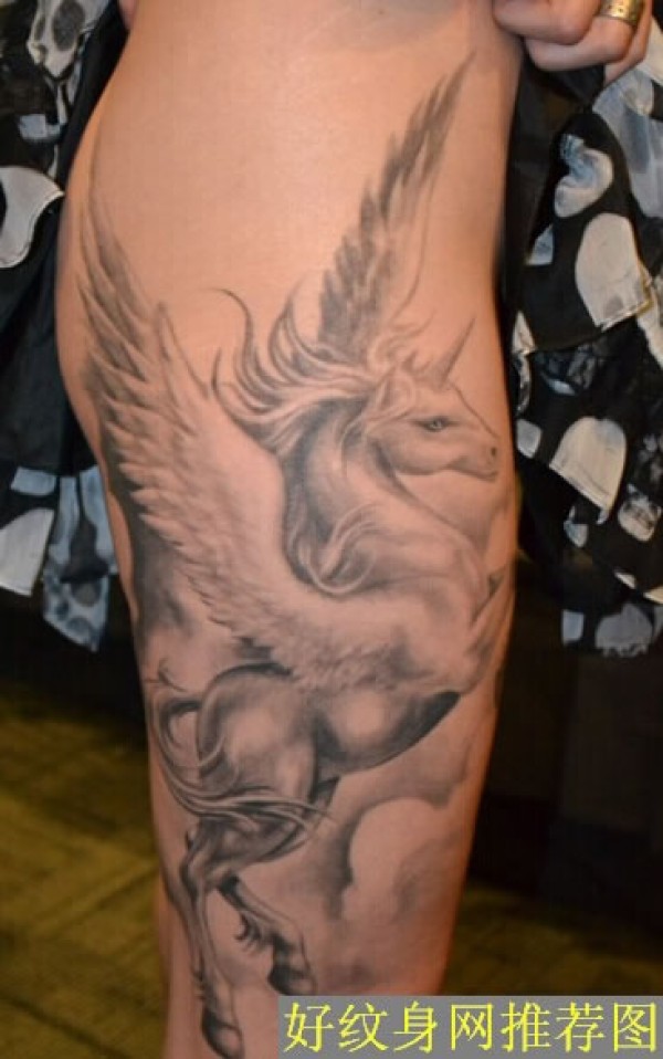 小腿上素色天马独角兽纹身扑腾欲飞的独角兽素_腿部纹身图案大全_纹身图吧