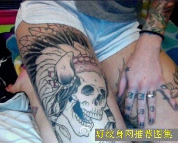 大腿上的大型骷髅头图案纹身印第安装束的骷髅_腿部纹身图案大全_纹身图吧