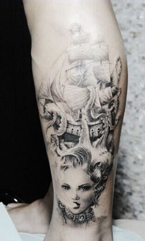 小腿上的人物图案创意纹身小腿上素色人物肖像_腿部纹身图案大全_纹身图吧