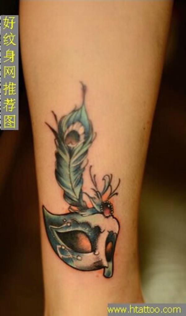 小腿上玩味十足的彩色面具纹身插着羽毛的面具_腿部纹身图案大全_纹身图吧