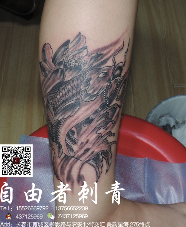 小腿上素色的鲤鱼荷花纹身刺青刚刚完成的鲤鱼_腿部纹身图案大全_纹身图吧