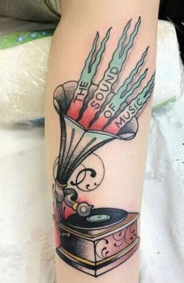 美女小腿上留声机图案彩色纹身复古图案加上非_腿部纹身图案大全_纹身图吧