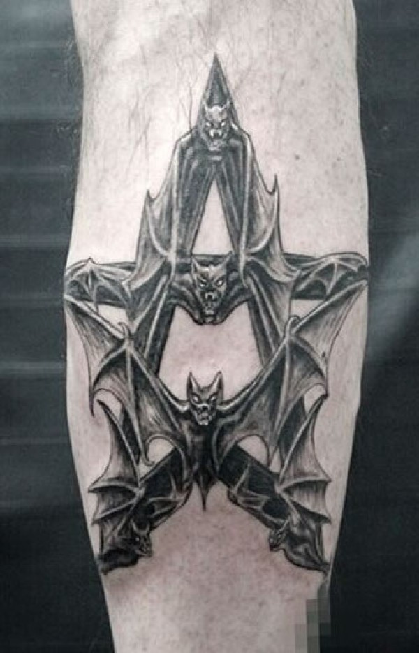 令人感到心悸的腿部蝙蝠纹身图由蝙蝠图案交织_腿部纹身图案大全_纹身图吧