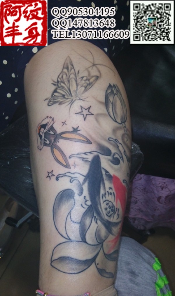 腿部兔八哥纹身图案鉴赏内容繁杂的组合纹身,_腿部纹身图案大全_纹身图吧