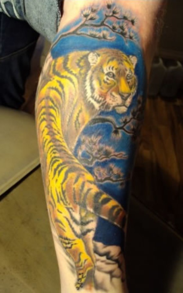 彩色的老虎纹身,小腿上黄色虎斑纹身老虎加迎_腿部纹身图案大全_纹身图吧