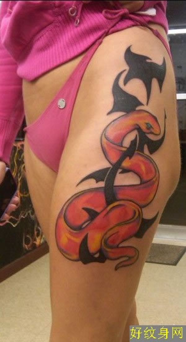 盘绕在美女大腿上的蛇纹身大腿上的红色蛇纹身_腿部纹身图案大全_纹身图吧