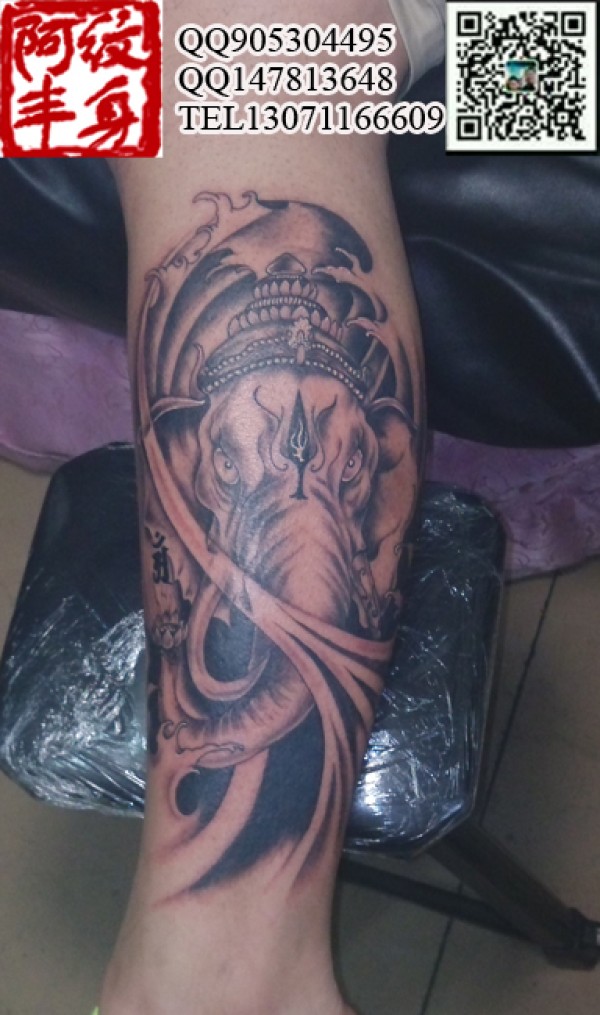 小腿上煞气凌人的象神纹身图面露凶相的象神纹_腿部纹身图案大全_纹身图吧