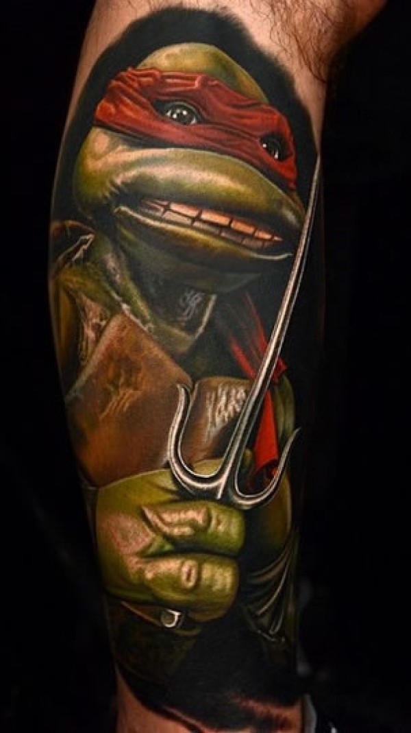 小腿上忍者神龟图案纹身手拿武器准备战斗的忍_腿部纹身图案大全_纹身图吧
