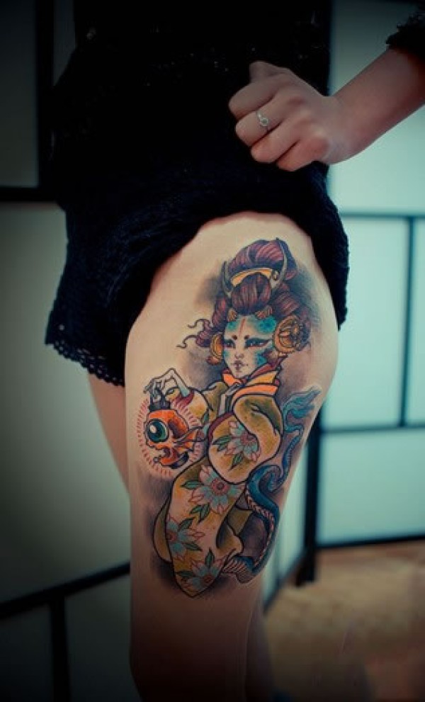 美女大腿上漂亮的彩绘艺妓纹身图案这款纹身图_腿部纹身图案大全_纹身图吧