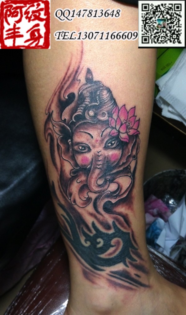 头上戴着荷花的象神纹身图案素色带花的象神纹_腿部纹身图案大全_纹身图吧