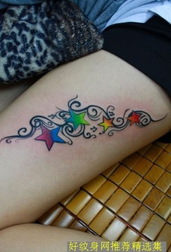 美女性感大腿上的彩色五角星纹身图案大腿上彩_腿部纹身图案大全_纹身图吧