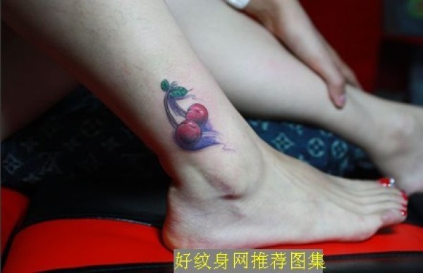 小腿上一对彩色的樱桃纹身作品紫色流云打底的_腿部纹身图案大全_纹身图吧
