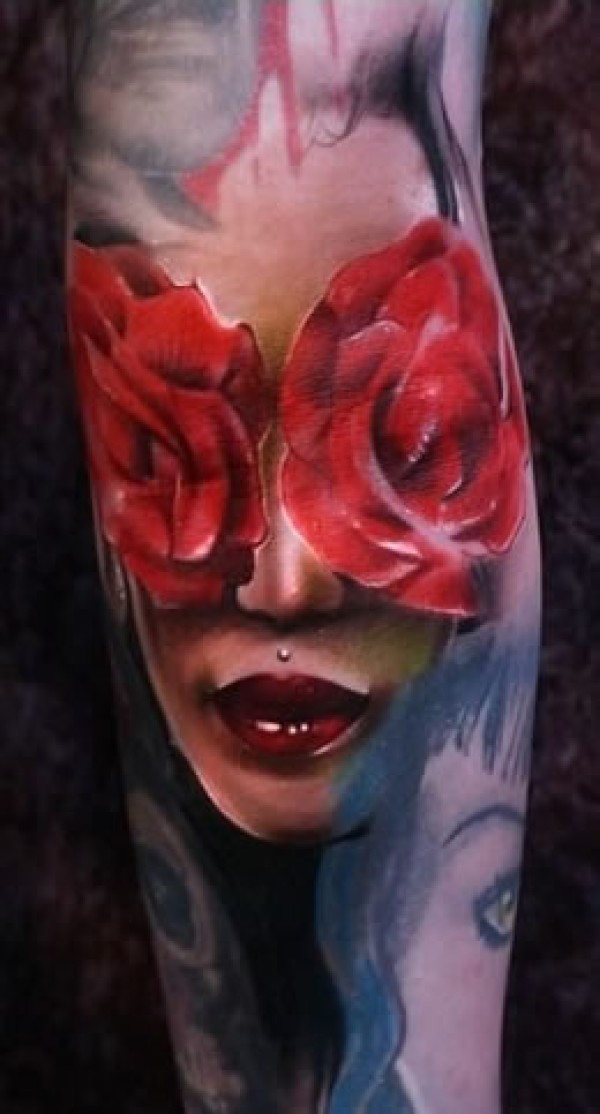 小腿上大花朵人脸图案纹身红色花朵遮盖的人脸_腿部纹身图案大全_纹身图吧