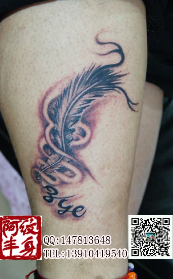美女腿部带流云的羽毛纹身图案大腿上素色羽毛_腿部纹身图案大全_纹身图吧