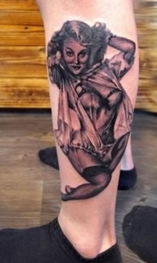 小腿上性感的黑丝舞女图案纹身搔首弄姿的黑丝_腿部纹身图案大全_纹身图吧