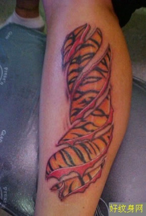 小腿上的虎纹图案纹身非常有创意的虎纹纹身图_腿部纹身图案大全_纹身图吧