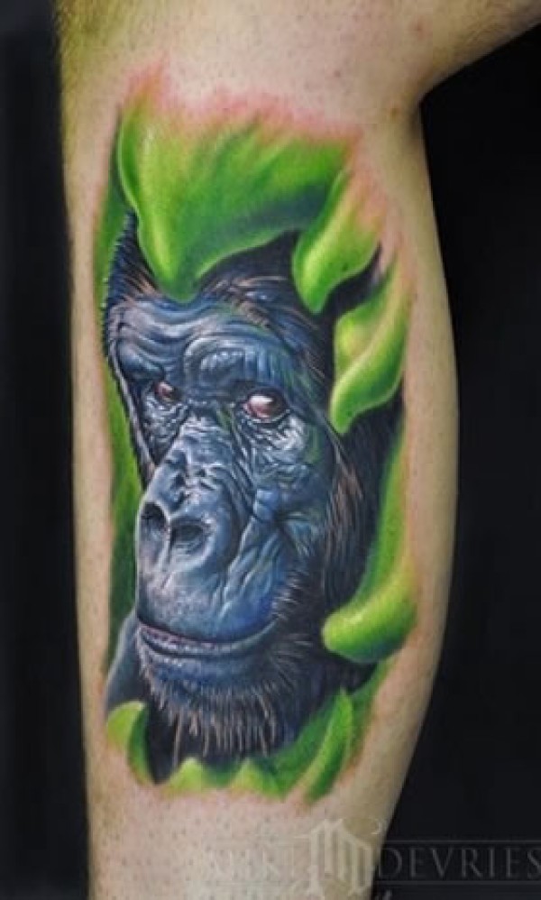 小腿上表情呆萌的黑猩猩纹身图绿色衬托的黑猩_腿部纹身图案大全_纹身图吧