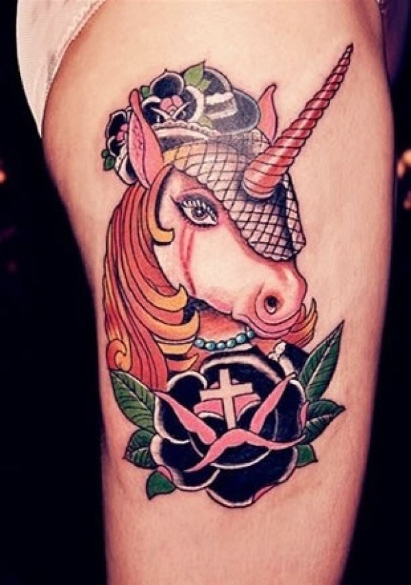 美女雪白大腿上的彩色独角兽纹身图彩绘独角兽_腿部纹身图案大全_纹身图吧