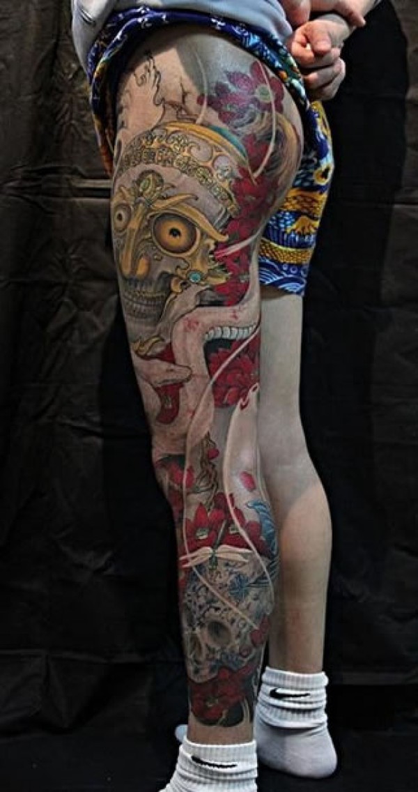 恐怖气息的彩色花腿纹身图片彩色带花骷髅头花_腿部纹身图案大全_纹身图吧