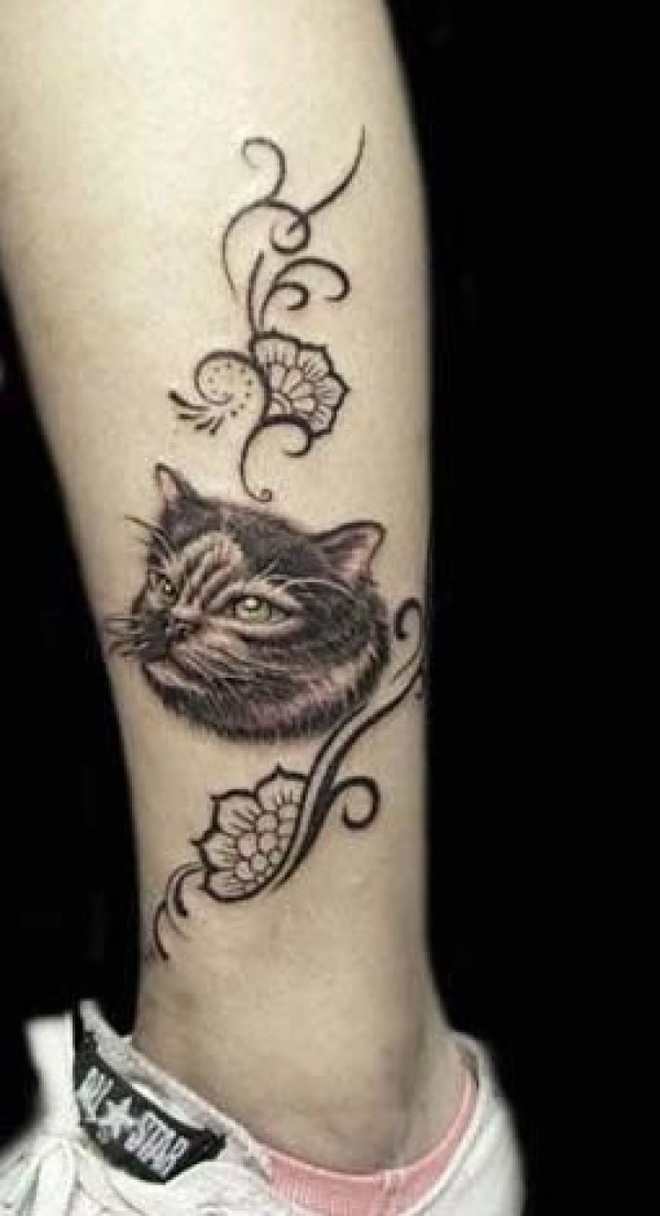 小腿上加花藤的猫咪纹身图案纹身图案中的猫咪_腿部纹身图案大全_纹身图吧