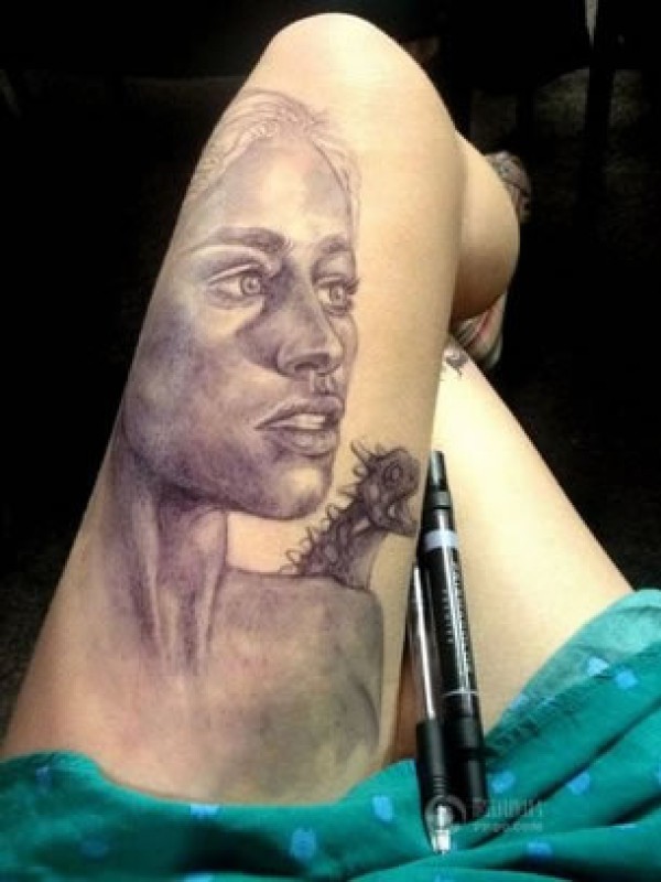 性感大腿上的人脸肖像纹身图部落居民肖像图案_腿部纹身图案大全_纹身图吧