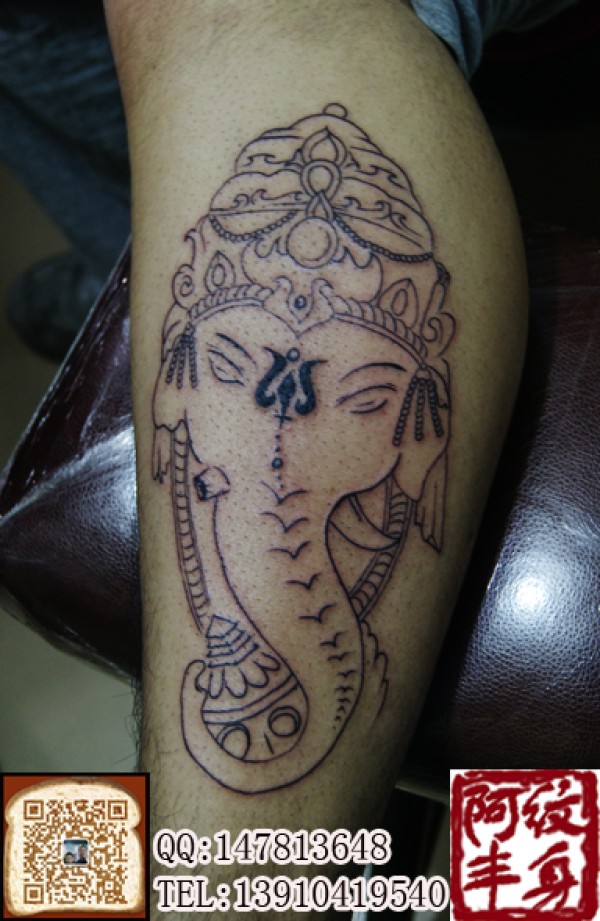 腿部线条刻画的象神图案纹身小腿上简笔画线条_腿部纹身图案大全_纹身图吧
