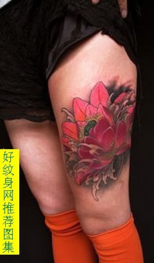 白皙大腿上盛开的鲜花图案纹身红色荷花图案,_腿部纹身图案大全_纹身图吧