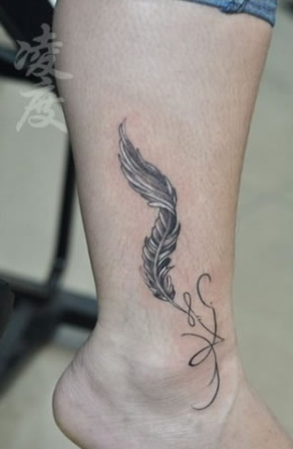小腿上素色的羽毛纹身图凌度纹身馆推荐的腿部_腿部纹身图案大全_纹身图吧