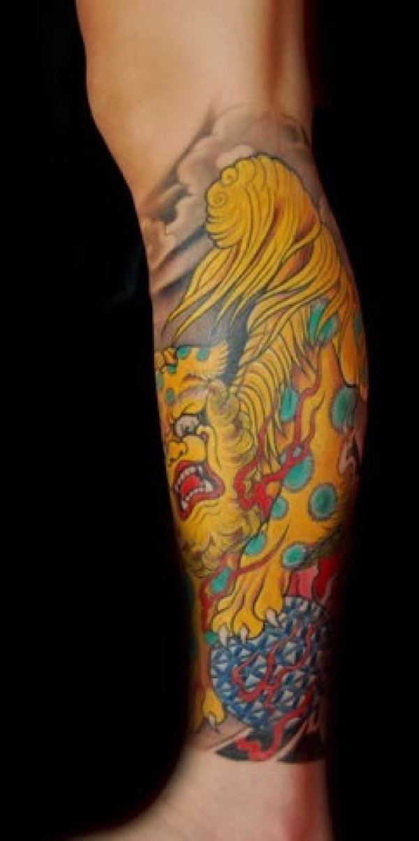 黄色的唐狮滚绣球纹身图腿部带斑点的黄色唐狮_腿部纹身图案大全_纹身图吧