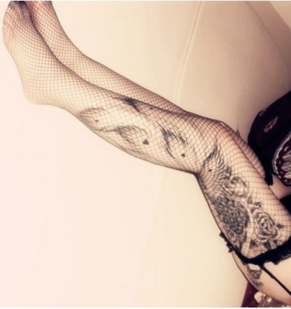 女生腿上的羽毛纹身图虽然纹身隐藏在丝袜底下_腿部纹身图案大全_纹身图吧