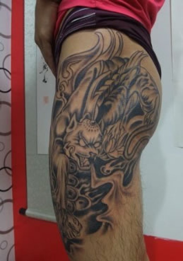 大腿外侧的吉祥神兽纹身图神兽图案看起来凶神_腿部纹身图案大全_纹身图吧