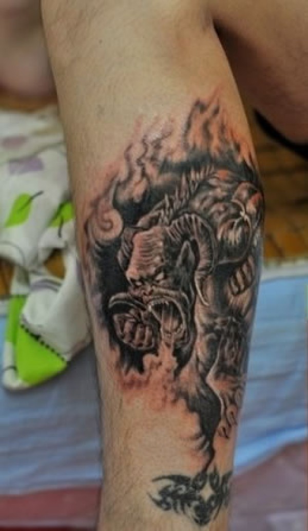 腿部黑恶的咆哮魔头纹身图图案很是煞气哦_腿部纹身图案大全_纹身图吧