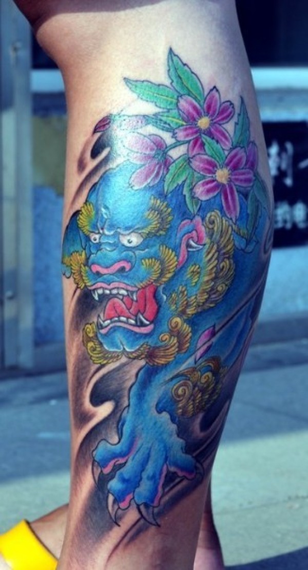 两款带花的蓝色唐狮纹身图虽然纹身图案上带着_腿部纹身图案大全_纹身图吧