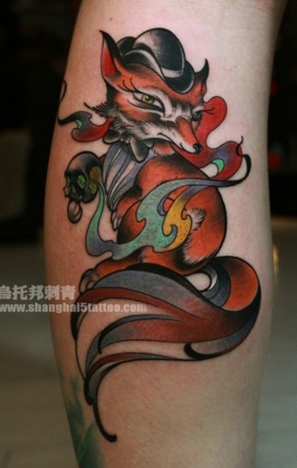 腿部彩绘狐狸纹身狐狸是非常狡猾的动物,纹身_腿部纹身图案大全_纹身图吧