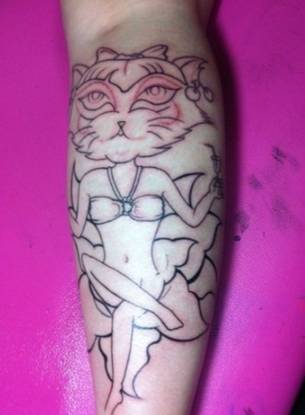 腿肚子上的猫咪美女纹身这是简化的线条纹身,_腿部纹身图案大全_纹身图吧