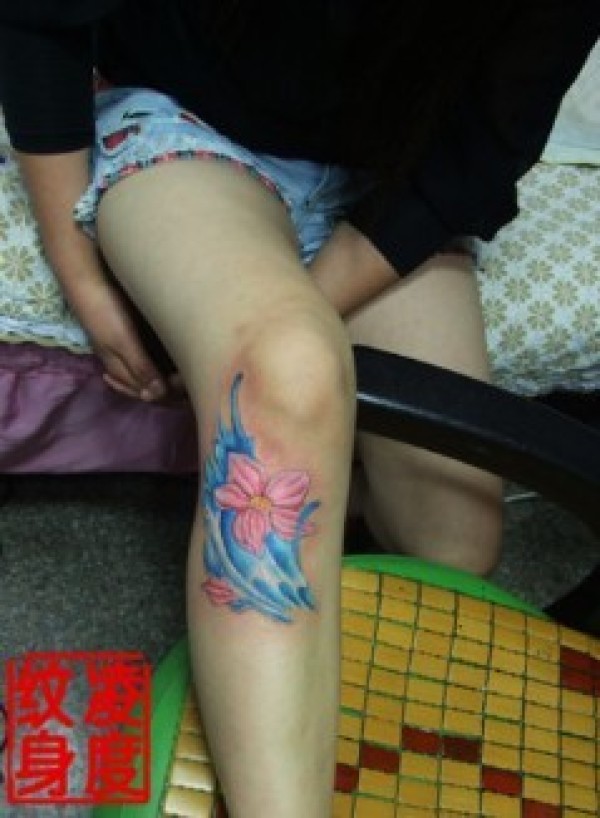 腿部膝盖上的蓝底红花图案纹身嫣红色的花儿纹_腿部纹身图案大全_纹身图吧