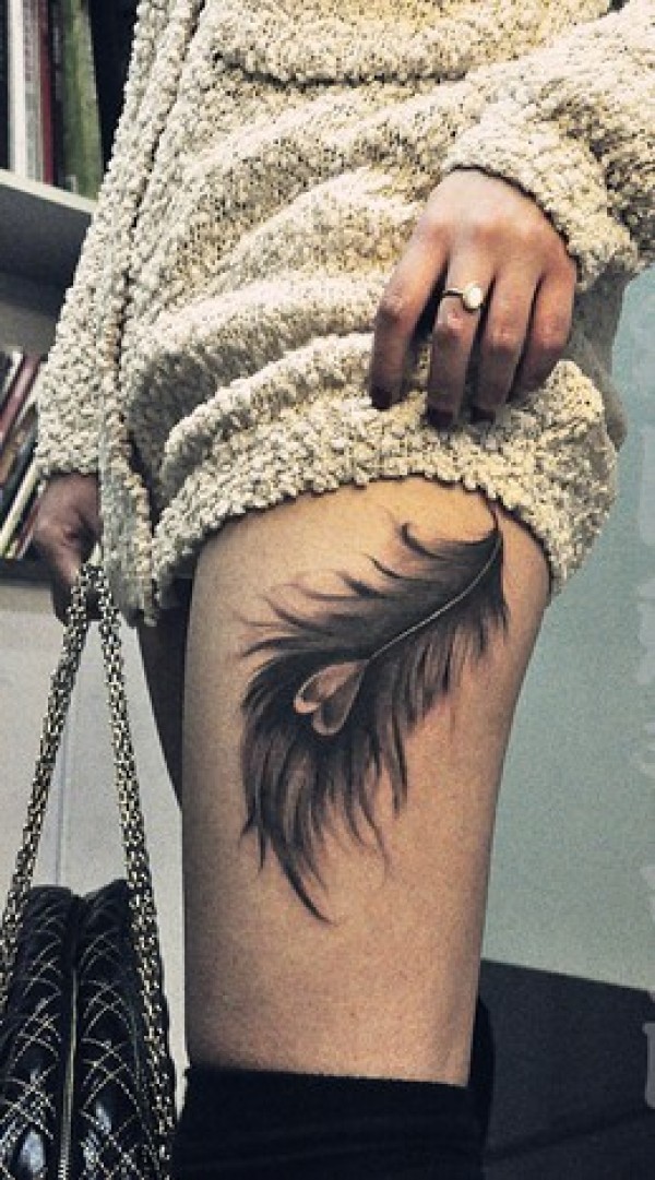 女生腿部羽毛纹身,能纹再上一点吗某些部位的_腿部纹身图案大全_纹身图吧