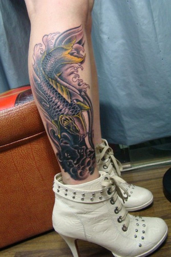 高跟鞋上的彩色游鱼纹身_腿部纹身图案大全_纹身图吧