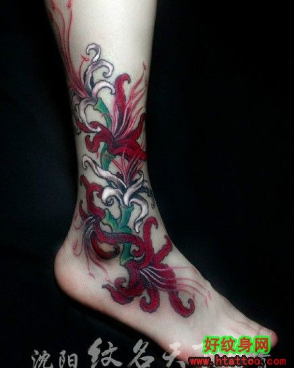 美女叫上血红的彼岸花纹身,老外也喜欢_腿部纹身图案大全_纹身图吧
