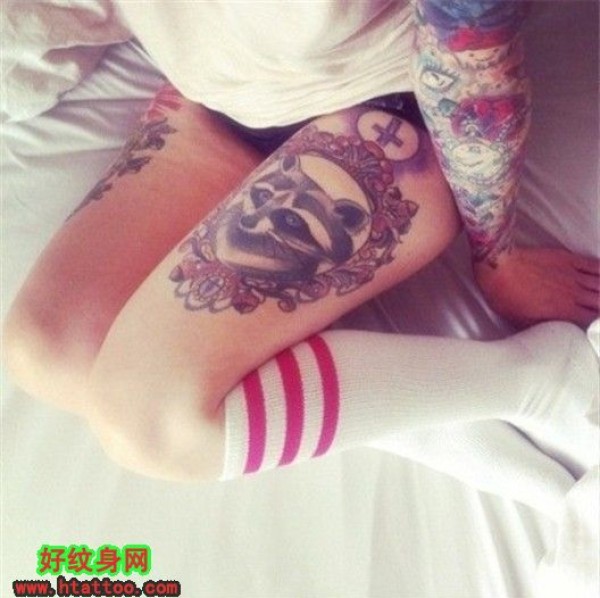 女生腿部彩色图腾欧美猫纹身_腿部纹身图案大全_纹身图吧